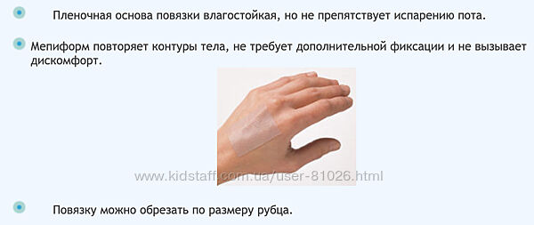 бережную и удобную адгезию минимальное травмирование рубца и окружающей его кожи не требует дополнительной фиксации заметное снижение болевых ощущений.