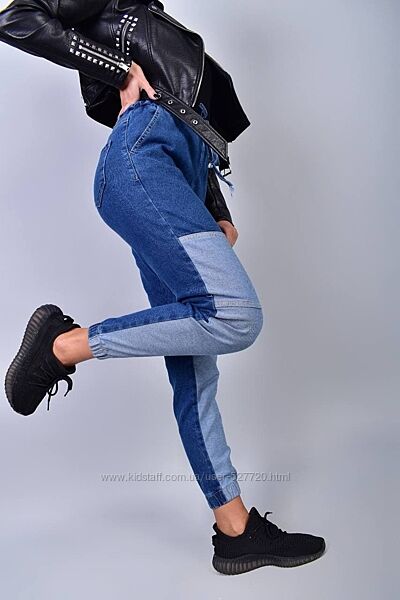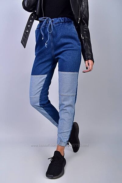 Стильные женские двухцветные джинсы-джоггеры понравятся тем ценителям моды, кому надоели дыры и потертости или однотонные кажутся немного скучными. Пояс собран на резинку, регулируется шнурком. Низ штанов также на резинке.Имеются боковые карманы, и сзади два накладных кармана.