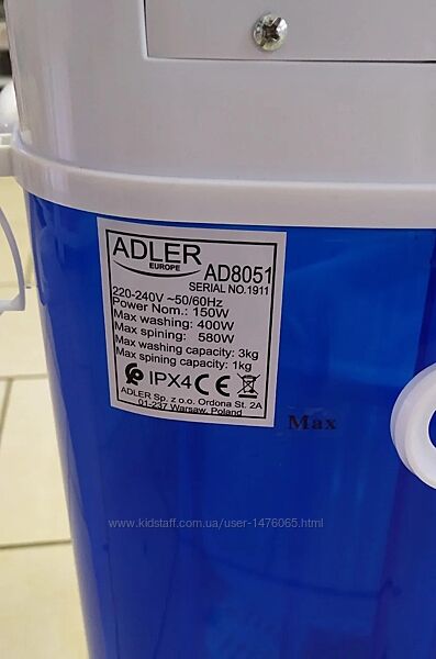 Привезенная из Германии новая компактная стиральная машина Adler AD8051/Camry CR8054. Макс. загрузка для стирки -3 кг, макс. загрузка для отжима - 1 кг, макс. мощность потребления при стирке - 400 Вт, при отжиме - 580 Вт, механический таймер на стирку 15 минут, механический таймер на отжим - 5 минут, стиральная машина не требует подключения к водопроводу, что очень удобно на даче, в путешествиях и пр., оснащена сливным шлангом для слива использованной воды, страна производства - Польща, габариты (ВхШхГ) - 50х36х37 см. Отличное европейское качество. Педоставляется настоящая документированная гарантия - 6 месяцев.Оплата - наложенный платеж либо предоплата на карту. Способы доставки: самовывоз, Новая Почта, Укрпочта, Деливери, Justin (отправка 2 раза в неделю). Возврат товара – в течении 14 дней при сохранении упаковки и отсутствии следов его использования.