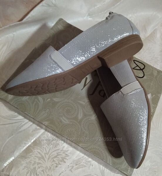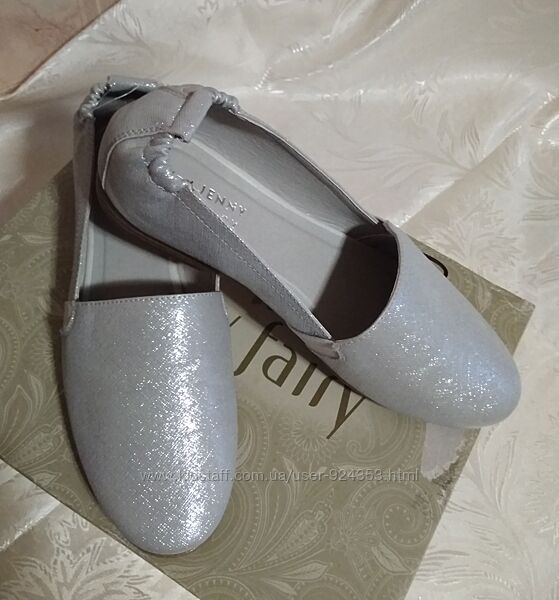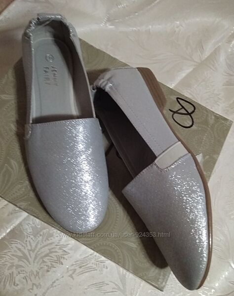 Новые удобные и легкие туфли-слиперы серебристого цвета, размер 39, по стельке 25 см, ширина 8 см, высота каблука – 1.5 см.Туфли сделаны из качественной искусственной кожи без постороннего запаха, чуть фактурной сверху, внутри тоже искусственная кожа, подошва прочная.