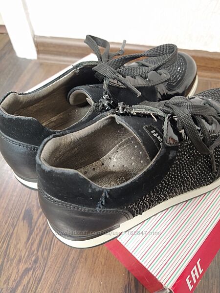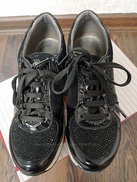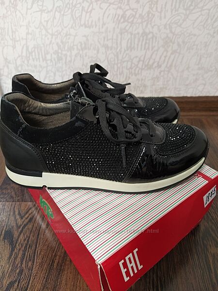 Удобные очень качественные кожаные кроссовки для девочки в коробке. Комбинация кожи и стразов. Высокая подошва, не промокают.Размер 35, на ножку до 22.5см