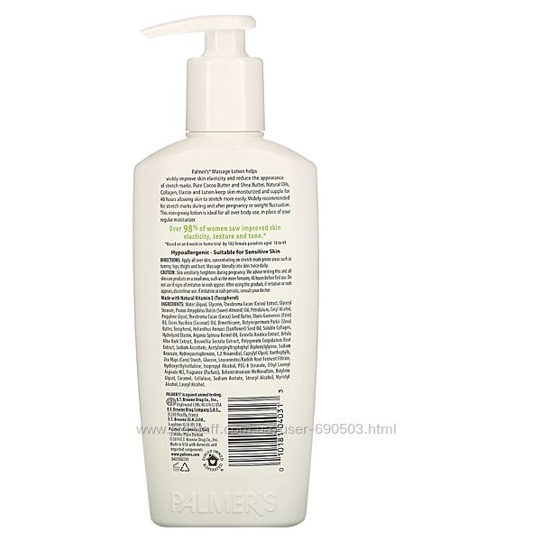 Лосьон для массажа Palmers 250 ml. делает кожу более эластичной, уменьшает видимость следов растяжек. Чистое масло какао, масло ши, натуральные масла, коллаген, эластин и лютеин поддерживают увлажненность и эластичность кожи в течение 48 часов. Широко рекомендуется для нанесения на следы растяжек после беременности или скачков веса. Нежирный лосьон идеально подойдет для нанесения на всю поверхность тела как регулярное увлажняющее средство.Рекомендации по применению: