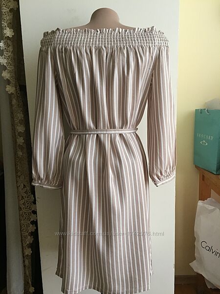 Новое (с этикеткой) стильное модное нежное легкое нарядное натуральное платье в полосочку, очень приятное к телу, носится с открытыми плечами,с красивым модным рукавом!Замеры;ПО под мышками 53 см,ПОГ 53 см,ПОТ 53 см,ПОБ 55 см,длина от плеча и низа платья 84.5 см.но оно на человеке будет длинее,т.к. оно носиться приспущенно на середине плеча, Идеально подходит для любого типа фигуры. Но его лучше носить не обтяжку, а свободным! Тогда оно красивее смотрится! С бумажной биркой,не носилась.Просто не подошло по размеру! На фото на девушке 3/4 рукав,а у моего платья длинный рукавчик!Состав: