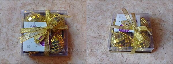Новый набор из 4-х золотистых диско-шаров со стеклянными мини-пластинами - 150 грн. Размер упаковки 8 х 8 см.