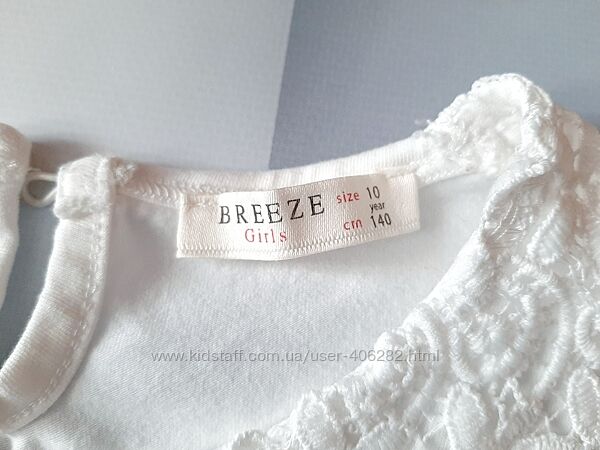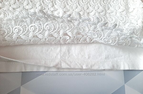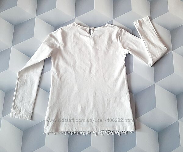 Блузка трикотажна з мереживом насиченого молочного кольору, фото не передає. В ідеальному стані, не носили зовсім (переросли), тільки приміряли. Бірочка не збережена. Вказано розмір 140, більшомірить 🏷Заміри: Плечі- 30 ОГ- 37 Рукав від плеча- 48,5 Рукав по внутрішньому шву- 39,5 Довжина- 54,5 разом з мереживом