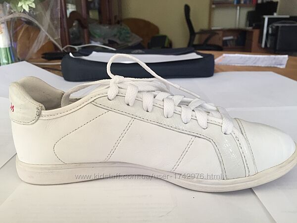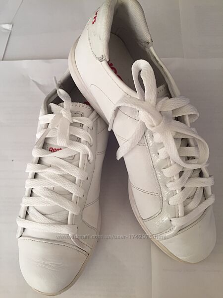 Брендовые белые кожанные удобные мягкие модные кроссовки REEBOK, длина стельки 22,5 см,размер 35,5.состояние идеальное,одевались только несколько раз, оказались маловаты,выглядят внешне почти как новые,почти не видно,что носились,Без коробкиСостав:100% натуральная кожа