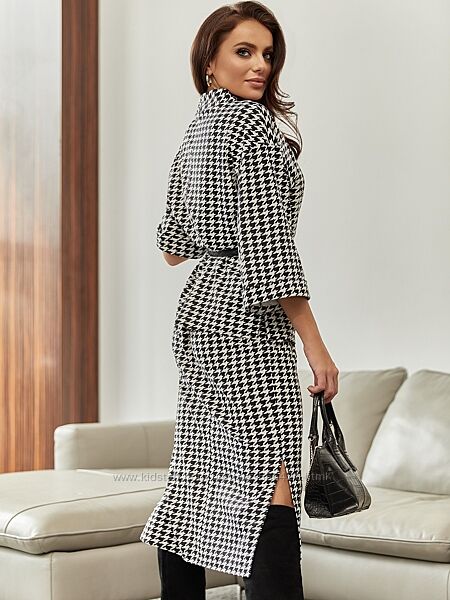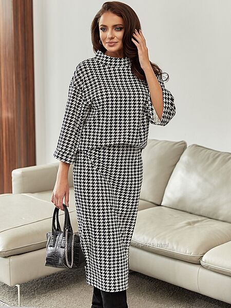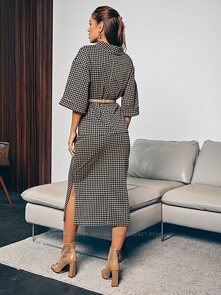 Стильный костюм в "гусиную лапку" фото 4-7 : джемпер с широким рукавом ¾ и прямая юбка с разрезами по бокам. Застегивается на молнию сзади. Пояс в комплект не входит.