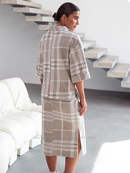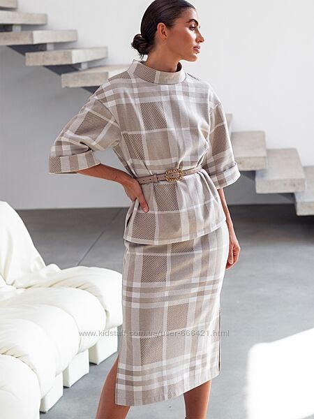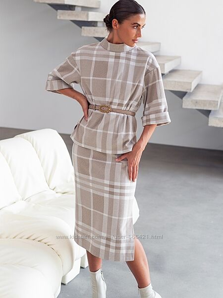Стильный костюм в клетку фото 8-10: джемпер с широким рукавом ¾ и прямая юбка с разрезами по бокам. Застегивается на молнию сзади. Пояс в комплект не входит.