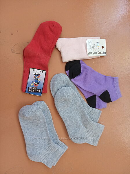 6 пар нових носочків Довжина ступні 15 см, але прекрасно тягнуться і в довжину, і в ширину на багато сантиметрів. З них 2 пари світло-сірих однакових, 1 пара світло-фіолетових з чорним, 1 пара червоні, 1 пара рожеві, 1 пара чорні. Усі абсолютно нові. Якість дуже висока, служитимуть багато днів. Склад сірих і фіолетових 80% хлопок, 17% поліамід, 3% лайкра. Склад рожевих 75% хлопок, 20% хлопок, 5% інше. Склад червоних 80% хлопок, 20% поліамід. Склад чорних 85% хлопок, 15% поліамід.