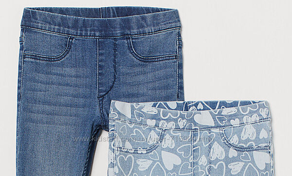 Джинсовые леггинсы (джеггинсы) H&M на девочку из эластичного денима.Пояс на широкой резинке, без утяжки. Спереди карманы-обманки. У синих леггинсах сзади два полноценных кармана