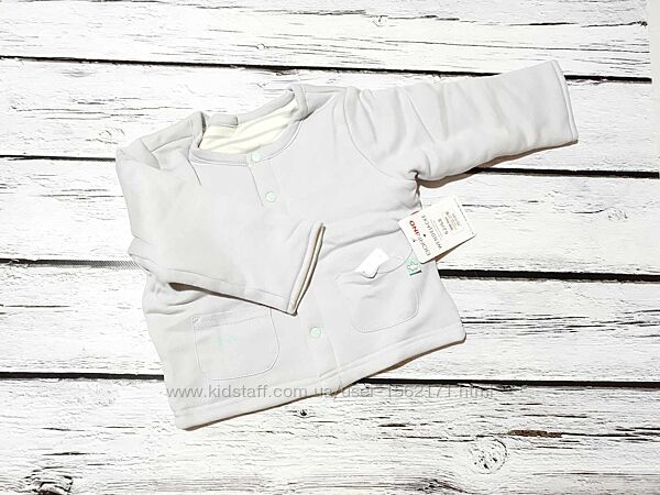 Чудова двостороння курточка на кнопках. Одна сторона світло-сіра, інша - світла в полоску.Верх 100% бавовна, всередині тонкий утеплювач 100% поліестер.