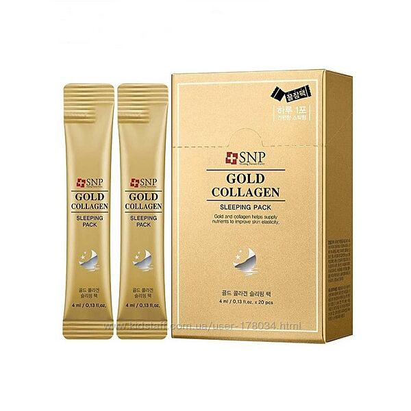 Ночная маска на основе золота и коллагена SNP Gold Collagen Sleeping Pack 4 mlМаска SNP Gold Collagen Sleeping Pack способствует увлажнению кожи, помогает выглядеть ей свежей и молодой. Великолепно разглаживает все морщины и оберегает кожу от старения, сохраняет эластичность и упругость кожи. Ночная маска интенсивно работает на регенерацию кожи.