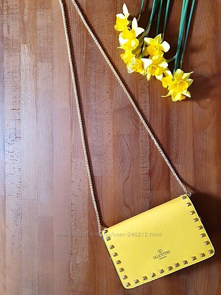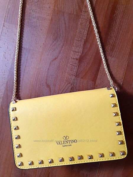 Яркая желтая сумочка в стиле Валентино .На плечо , цепочка , внутри карман на молнии , застежка на магнит .