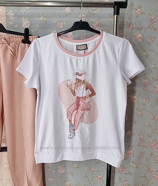 Шикарный летний костюм sogo размеры М украшен стразамиЗамеры М футболка ширина под руками 50 см длина 62 см брюки ширина в бедрах 53 см длина 99 см шаг 70 см