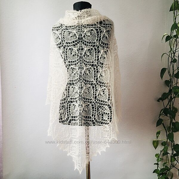 Розмір шалі- висота ( по спинці) 110 см, розмах крил 200 см.
