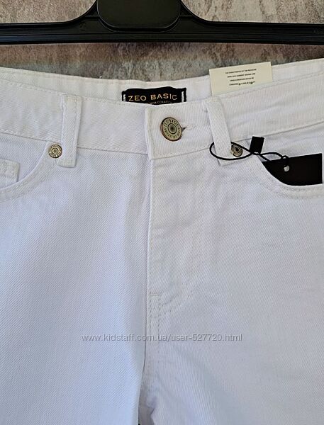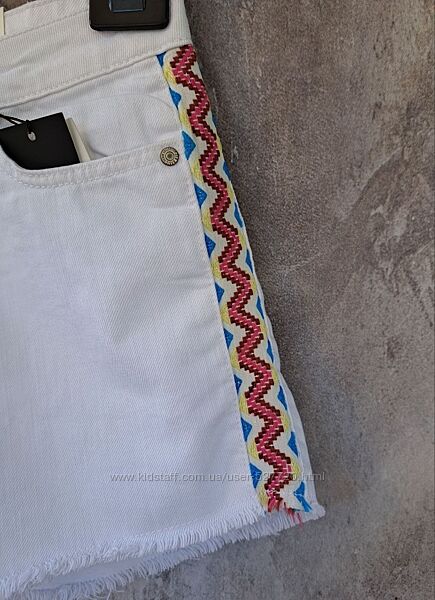 Женские джинсовые шорты белого цвета с узорчатыми лампасами. Застегиваются на молнию и пуговицу.Цвет - белый