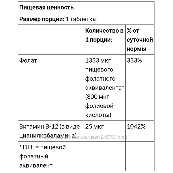 - Фолат 1333 мкг пищевого фолатного эквивалента (800 мкг фолиевой кислоты);
