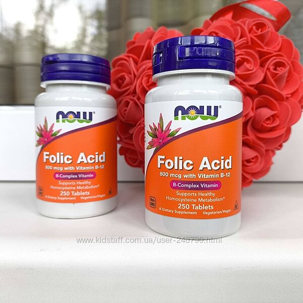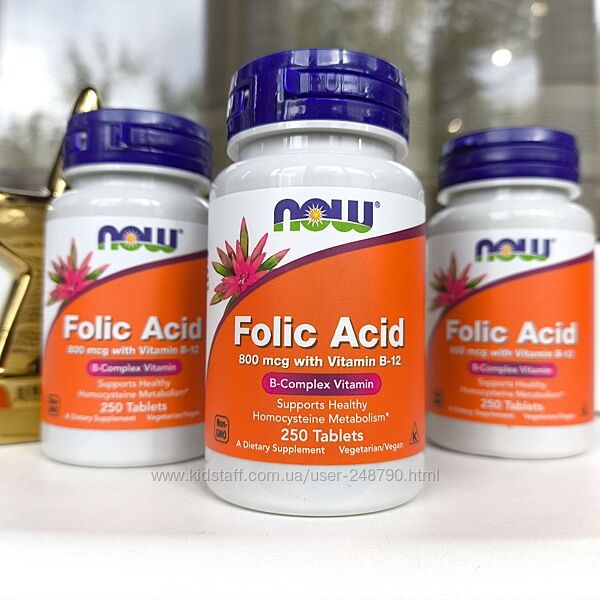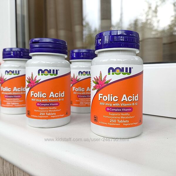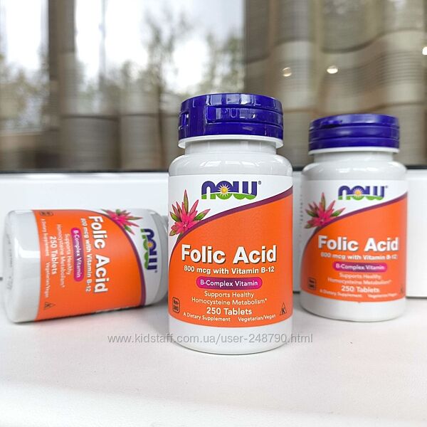 1) Фолієва кислота В9 з вітаміном В12, 800 мкг, В 9, В 12, США, 250 таблетокNow Foods Фолієва кислота B9 з вітаміном B12, 800 мкг, 250 таблеток
