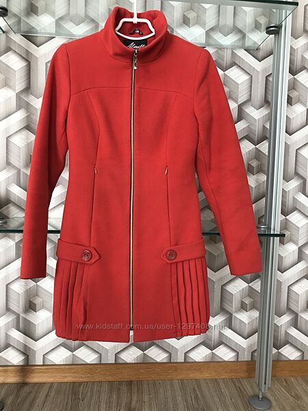 Фирменное пальто размер S, длина по спинке 80 см, подмышки 42 см, длина рукава от плеча 62 см, плечи 40 см, в составе 40 % шерсти, 2 фирменные куртки в подарок