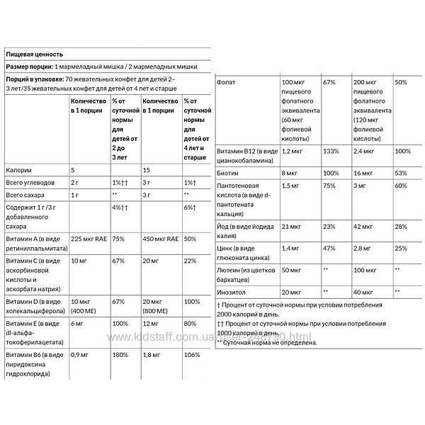 В качестве пищевой добавки можно давать детям от двух до трех лет по одной (1) жевательной мармеладке в день. Детям от четырех лет и старше можно давать по две (2) жевательных мармеладки в виде медвежонка в день. Попросите ребенка тщательно разжевывать каждую мармеладку Gummy Cutie.