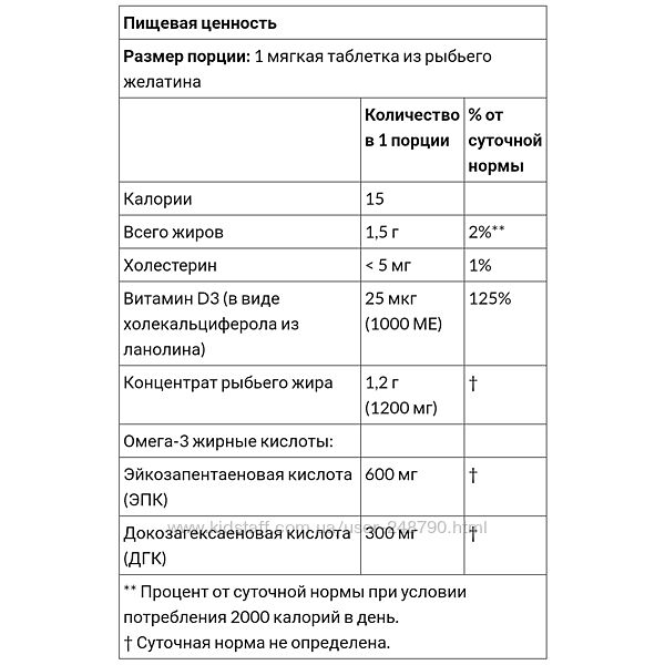 Порция 1 мягкая таблетка из рыбьего желатина содержит концентрат рыбьего жира 1,2 г (1200 мг), в том числе Омега-3 жирные кислоты 900 мг: