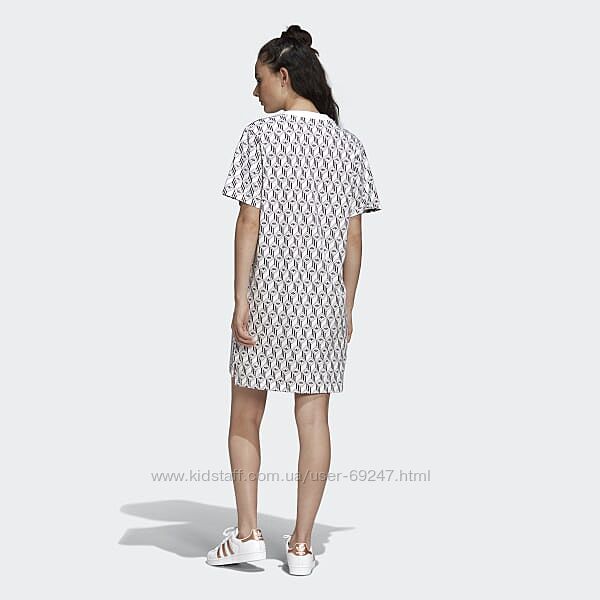 В этом платье классические логотипы adidas Originals, Трилистник и три полоски, превращаются в причудливый принт в стиле монограммы. Свободный силуэт, выполненный в виде удлиненной футболки, отлично подходит на каждый день. Модель выполнена из мягкого 100% хлопка.
