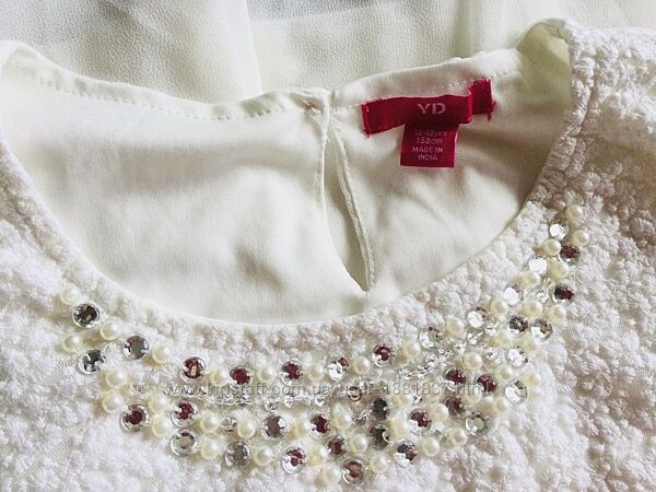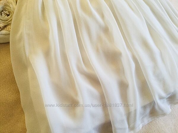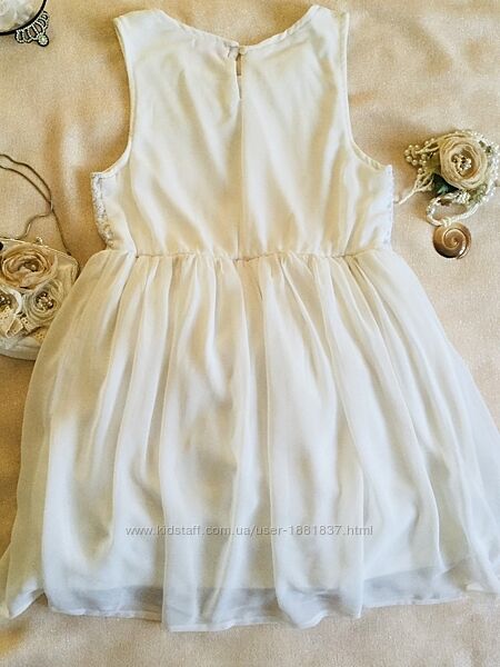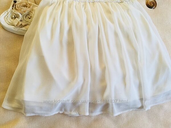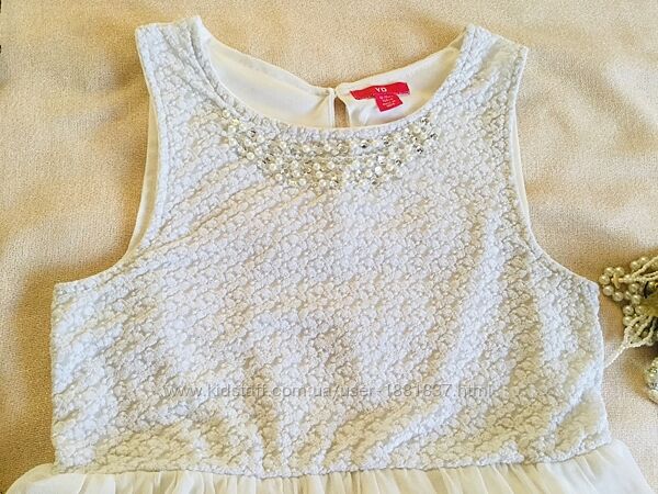 Young Dimension. Два размера. Белоснежное. пышное. Верх : ажурный гипюр , цветочное объемное кружево. Ворот расшит серебряным бисером , стразами и жемчужинками. Юбка - Нежный многослойный шифон на подъюбниках. Состояние нового. Следов носки НЕТ. Прекрасно для школы.12-14 лет. Длина 80; подмышки 44