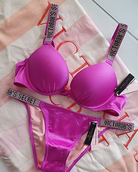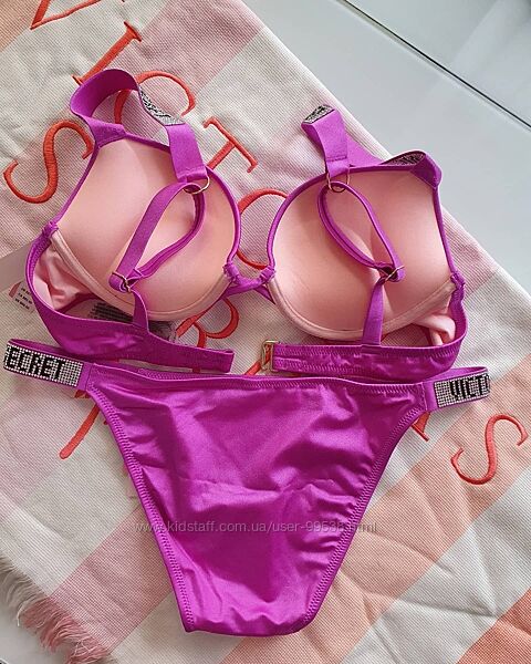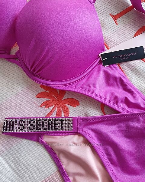 Сияй! В новом купальнике из коллекции Bombshell с двойным пуш-ап. Ткань с шимером невероятного розово-сиреневого цвета, лого выложено стразами.Верх в размере 34А на 75А/70В примерно. Плавочки модель Bikini в размере S , на бедра 90-96 см примерно.