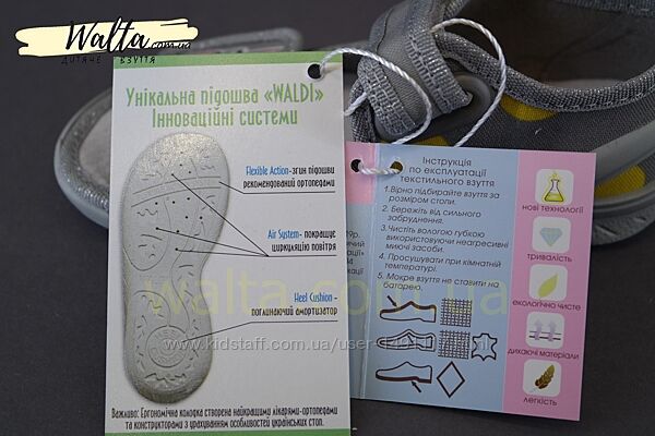 Внешняя поверхность обуви и подкладки изготовлена из натуральных «дышащих» тканей. Легкая подошва из ПВХ не оставляет следов на полу. Стелька ортопедическо-профилактическая с супинатором. Модель, дизайн создан конструкторами, технологами, докторами-ортопедами. Все больше мам отдают предпочтения именно тапочкам «WALDI». Отличный вариант для садика, дома или прогулок летом на свежем воздухе. Задник жестковатый. Стелька входит в комплект тапочек, вклеена.