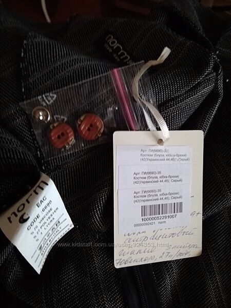 Костюм новый, с бумажным и вшитым ярлыками, с запасными пуговицами, без брака либо дефектов. Возврата нет.