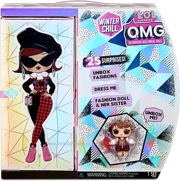 Особливості: 1. Великі та яскраві лялечки 28 см, новий одяг, волосся, аксесуари. 2. 25 сюрпризів при розпакуванні ляльок L.O.L. Surprise! серії "O.M.G. Winter Chill". 3. Коробку можна використовувати в якості гардеробної, а також для зберігання речей та аксесуарів лялечки. 4. Лялька має шарнірні руки, що дає можливість вигадувати ще більше цікавих сценаріїв для гри. 5. Підставка для ляльки може бути як підставкою, так і стільчиком.