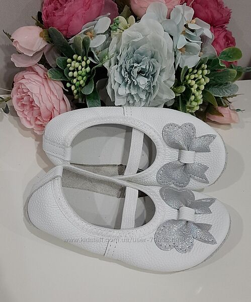 Шкіряні чешки з бантиком із срібної голографічної абр білої перламутрової шкіри.Дуже зручні, м´які, легко і зручно взувати.