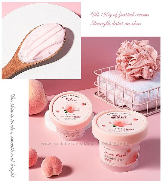 Скраб для тела Laikou Peach с экстрактом персика и азиатской центеллой 190гСкраб помогает быстро избавиться от загрязнений и шелушений. Продукт богат на масла, витамины и микроэлементы. Они не только глубоко очищают кожу, но и питают ее, увлажняют и приводят в тонус. Одним из преимуществ является то, что скраб бережно и тщательно убирает ороговевшие частички эпителия, не травмируя верхний слой кожи. Среди большого спектра действия продукта можно выделить: