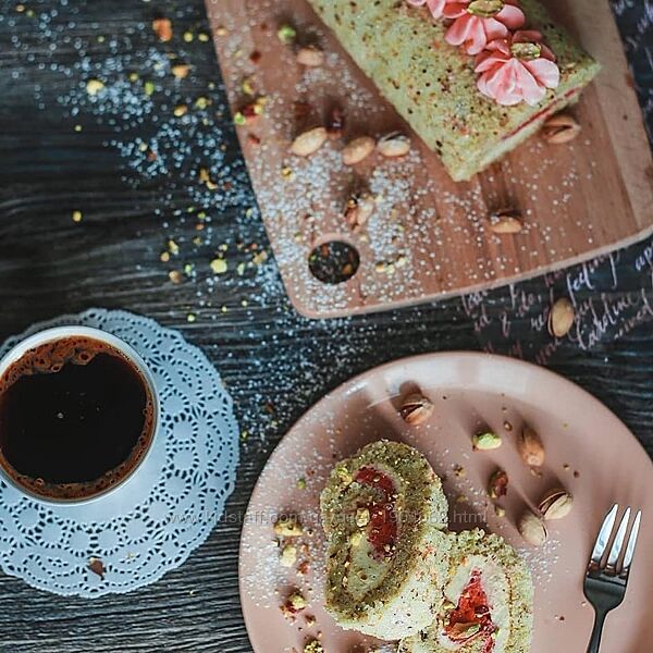 Фисташковый рулет с малиновым муссом и клубничным конфи