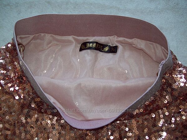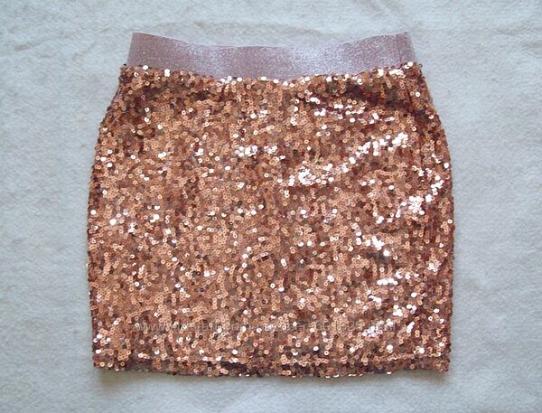 Пропоную нарядну спідницю в бежевих паєтках. Пояс гумка, є підкладка. Уживана акуратно, стан відмінний, дивіться фото.Розмір вказаний S/M, маломір. Довжина 40 см, ширина талії 34 см, тягнеться до 45 см, ширина стегон 42-48 см, трохи тягнеться.