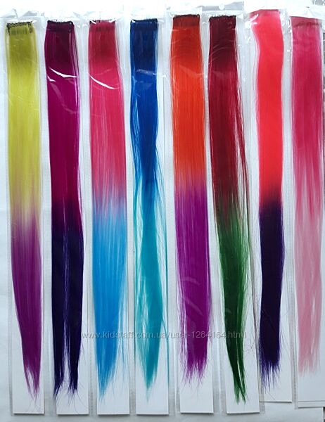 Накладні різнокольорові пасма, які фіксуються на заколках, довжиною 49 см. У наявності є однотонні (фото 1), 2-тонні (фото 2) та 3-тонні (фото 3).Вартість 1 пасма 60 грн.
