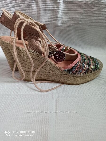 Шикарнючие босоножки на плетеной подошве фирмы Vidorreta 38 р. Испания. Натуральная кожа и ткань. Пяточка полностью из кожи. Носочек внутри из мягусенькой кожи а сверху ткань с люрексом. Заказала и не учла ширину ноги(подъём) Мне оказались узкими. Подойдут на худенькая ножку. Высота пятки 9,5 см. Под пальцами 3 см. Очень удобная колодка. Надевала в доме на пару минут. Состояние идеальное(в том же состоянии, что и приехали)Немного отличается расцветка.На одному присутствует желтоватый цвет а на втором он есть только в уголках. Видимо так шёл крой по ткани. На ноге это вообще не заметно, так как оно цветное и блестящее. Цену в наших магазинах добавка на скриншоте