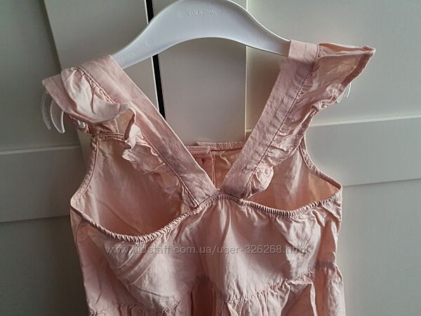 Платье без рукавов из легкого хлопкового холста. Бретели с оборками сходятся на спине. Застежка спереди и узкая резинка сверху на спинке. Отрезная талия и расклешенная юбка. Без подкладки.СоставХлопок 100%