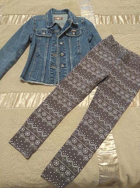 Джинсовый пиджак в отличном состоянии, немного приталенный, сидит по фигурке очень красиво.Рукав 44см, длина по спинке 43, ширина под рукавами 32 см-150грн.Лосины в отличном состоянии, хлопок 95 %.-100 грн.
