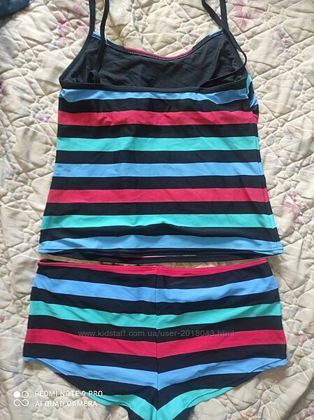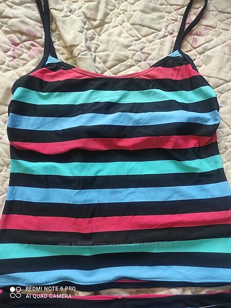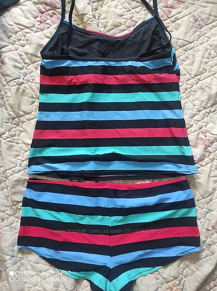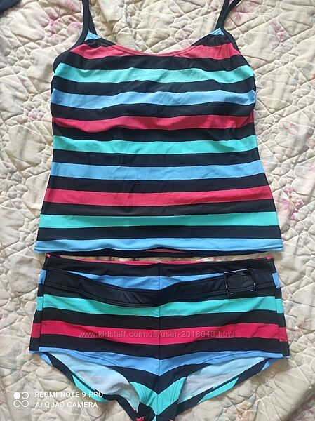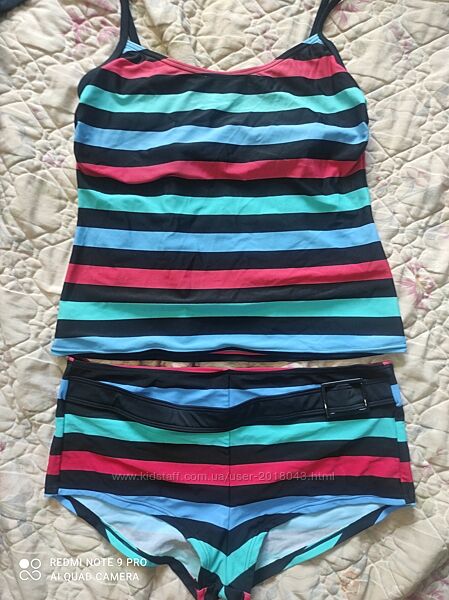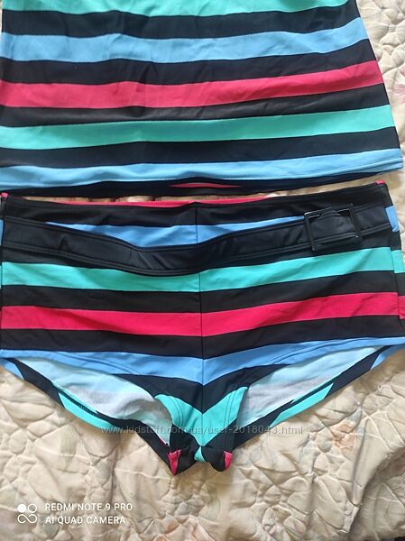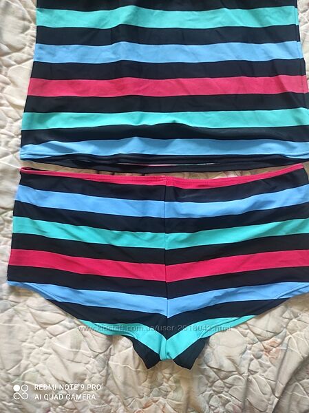 Яркий стильный купальник танкини : майка и плавки в бассейн пляж. Яркая майка в разноцветные полоски и плавки полушортики с черным пояском. В груди поддерживающая подкладка на резинке по кругу, как топ. Очень красиво эффектно смотрится на фигуре, на загар ещё красивее! Очень сильно стройнит. Танкини удобен для тех, кто хочет и полноценно позагорать и скрыть животик, шрамики. Также идеально для беременных. Идеальное состояние. Размер на фото, замеры скину.Спрашивайте больше вопросов лучше 😉 всегда рада ответить 😉 обязательно обдумать свою покупочку 👆