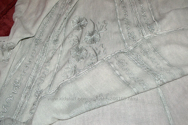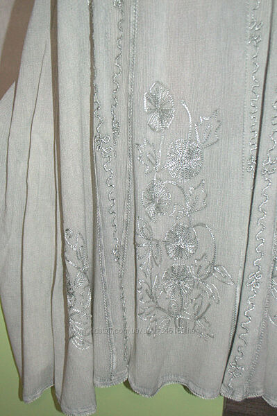 Очень удобная в носке и уходе,лёгкая,красивая юбочка из вискозы(100% натуральная). Совсем немного просвечивается.Если уже совсем Вам претит такой нюанс,то очень просто подшить снизу небольшой длины подклад.Удобный пояс на резинке (3см) + дополнительно шнур для стягивания. За счёт фасона подойдёт на размер от 44 до 48.Материал жатый,легко сохнет и практически не нужно гладить.Вся вышивка на месте,целенькая.