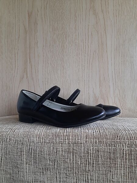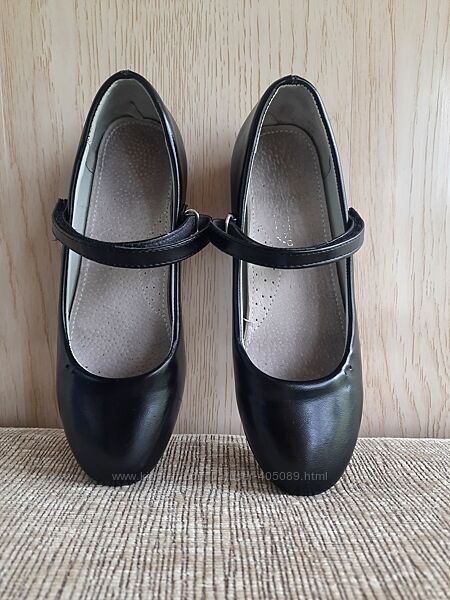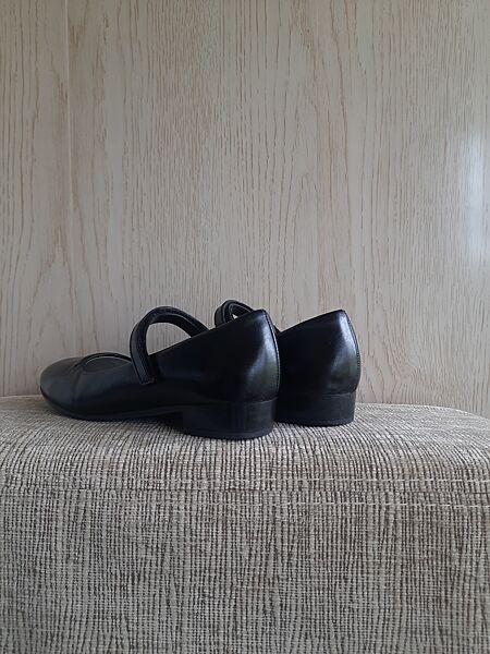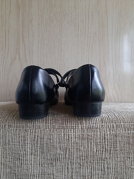 Чёрные туфельки. Размер указан 36. Маломерят, длина стельки 22 см. соответствует размеру 34. Верх кожзаменитель, стелька кожаная с супинатором. Туфли в хорошем состоянии.