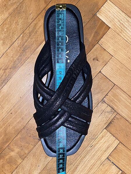 Шльопки босоніжки на невеличкій платформі. Шкіра натуральна колір мокрого асфальту з перламутром. Підійдуть на р. 39-40. Стан нової речі - взуті один раз- не підійшов розмір.Виглядають дуже нарядно.