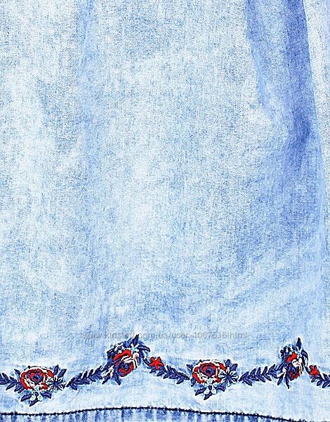 Юбка солнце-клеш из денима с мраморным эффектом. На талии эластичный пояс, спереди на юбке складки. По низу юбки - цветочная вышивка. 100% хлопок. Размер 164.Замеры: талия - 31см, тянется до 38 см, длина - 43,5см.