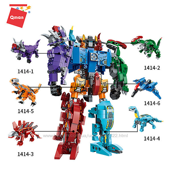Подробное описание: Конструктор Qman 1414 Динозавры трансформер 6в1 520 деталей