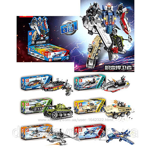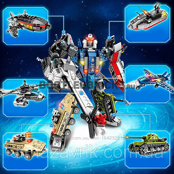 Тематический конструктор из серии "Военная техника", состоящий из 735 деталей, соединив которые у вас получится собрать 6 разных видов транспорта и одного огромного робота трансформера.