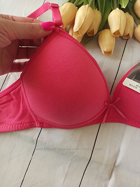 Бавовняні бюсти з формованими чашками трикутної форми на тонкому поролоні. Склад: 95% бавовна, 10% спандекс. Бюст на 2 гачки в три ряди, бретелі не знімні, чашка А.Розміри: