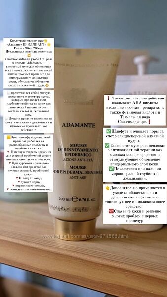 в ночном anti-age уходе 1-2 раза в неделю Adamante,— кислотный мусс для обновления всех типов кожи — 🧬это активный инновационный препарат для эпидермального обновления кожи, обусловлен действием кислот и алмазной пудры.💠