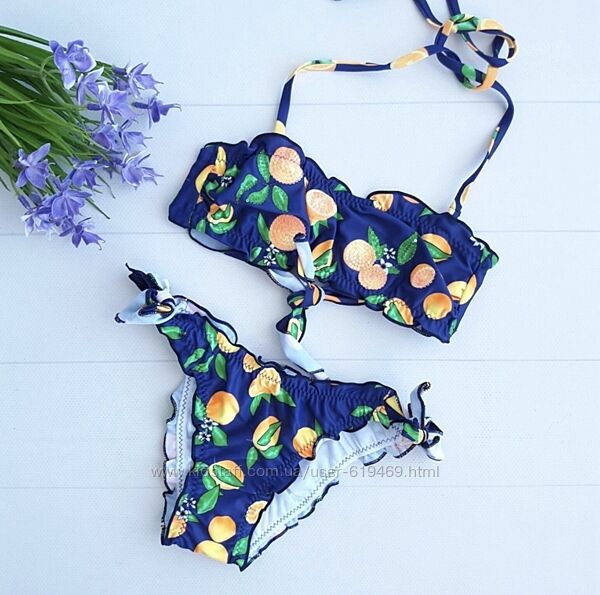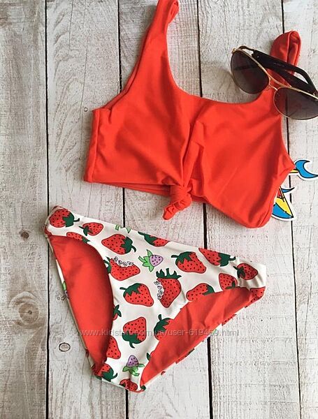 Очень сочный, красивый купальник. Плавки обычные, не завышенные, с красивым рисунком фруктов и ягод. Топ однотонный, мягкий, есть также вкладыши.