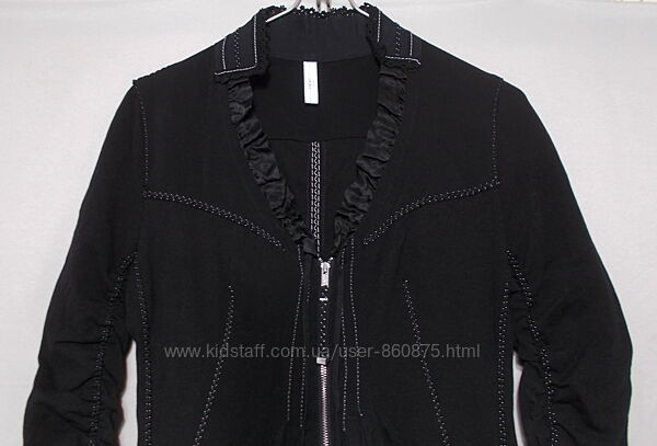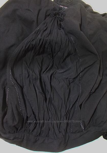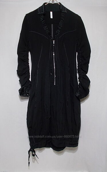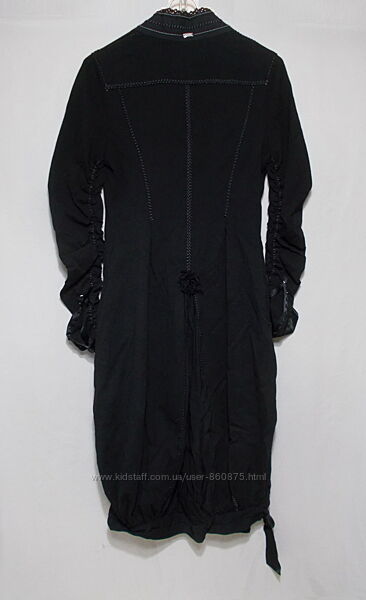Платье в состоянии нового. Ткань тонкая, основная -тяжело ниспадающая (750 грамм), оч-чень эластичная, второй выполнена задняя присборенная вставка в подоле (над ней пришит объемный цветок) и нижняя манжета, третьей (атласной) - присборенная отделка выреза ворота, манжеты с планками на рукавах и завязывающаяся сбоку лента-вставка в нижней манжете. Все швы отделочные (двойные и зигзагом) - контрастной белой нитью ко шву точечно пришита тонкая тесьма с лоском, спереди длинная молния с фирменным бегунком, длинные рукава присобраны по внутренней части эластичным швом, длинные планки на 8 пуговиц, спереди и сзади вертикальными швами образованы разной глубины складки, начинающиеся выше талии, за счет этого низ очень свободный, по бокам прорезные карманы, низ над манжетой можно пристегивать изнутри пуговицами (20 см от манжеты), за счет чего длина уменьшится, а край будет как у юбки-баллон, без подкладки.На оф сайте подобные стоят 840€